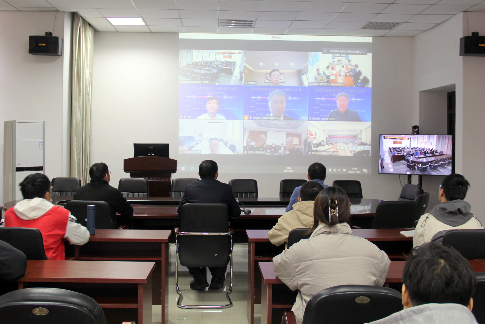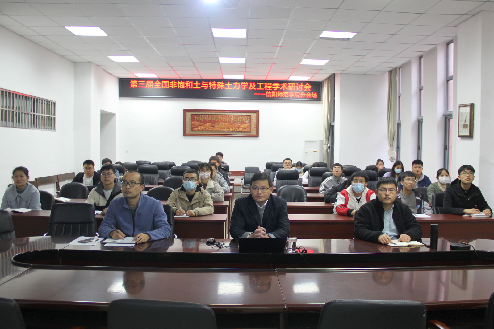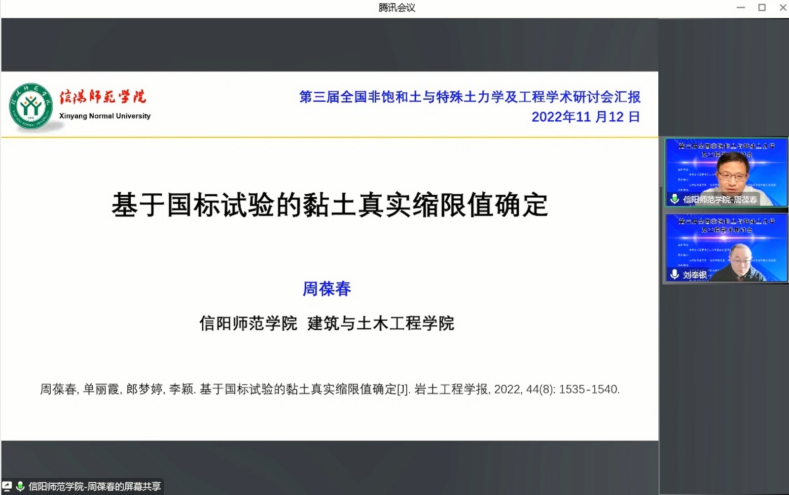我校在太阳成集团tyc151cc会议室设立了信阳师范学院分会场,分会场参会师生50余人。会议邀请太阳成集团tyc151cc院长周葆春教授作了题为“基于国标试验的黏土真实缩限值确定”的特邀报告。