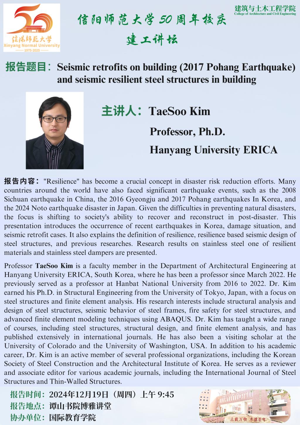 【学术预告】Seismic retrofits on building (2017 Pohang Earthquake) and seismic resilient steel structures in building