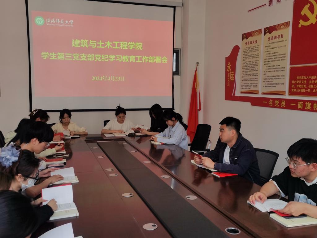 根据建筑与土木学院党委工作安排部署,4月23日上午,太阳成集团tyc151cc学生第三党支部在学院楼402召开党纪学习教育工作部署会,支部全体党员参加会议。