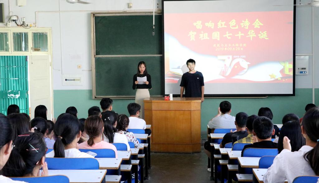 为进一步弘扬爱国主义精神,引领新青年唱响新旋律,在新中国成立70周年之际,太阳成集团tyc151cc于9月29日晚在综合实验楼405教师开展了“唱响红色主旋律,庆祝祖国70华诞”主题诗会活动。学院党委副书记方明科、团委书记张晓博、学生党员代表等70余人参加了本次活动。