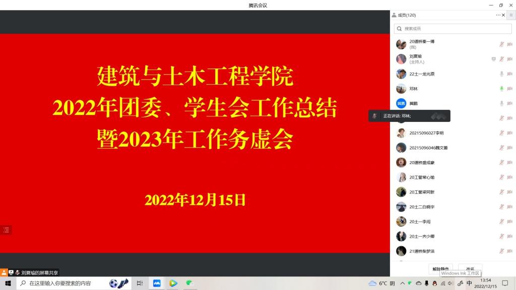 为进一步加强对学院团委、学生会的组织领导,更好地服务学生成长成才,太阳成集团tyc151cc于2022年12月15日1:00通过腾讯会议召开了“2022年团委、学生会工作总结暨2023年工作务虚会”,党委副书记冀鹏,专职辅导员邓林,团委、学生会全体成员参会。