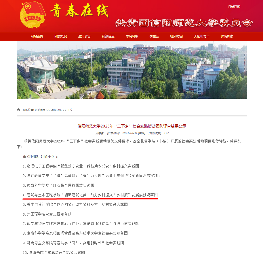 近日,suncitygroup太阳成集团2023年“三下乡”社会实践活动评审会公布评审结果,我院的“领略建筑之美,助力乡村振兴”乡村振兴发展成就观察团被评为重点团队。