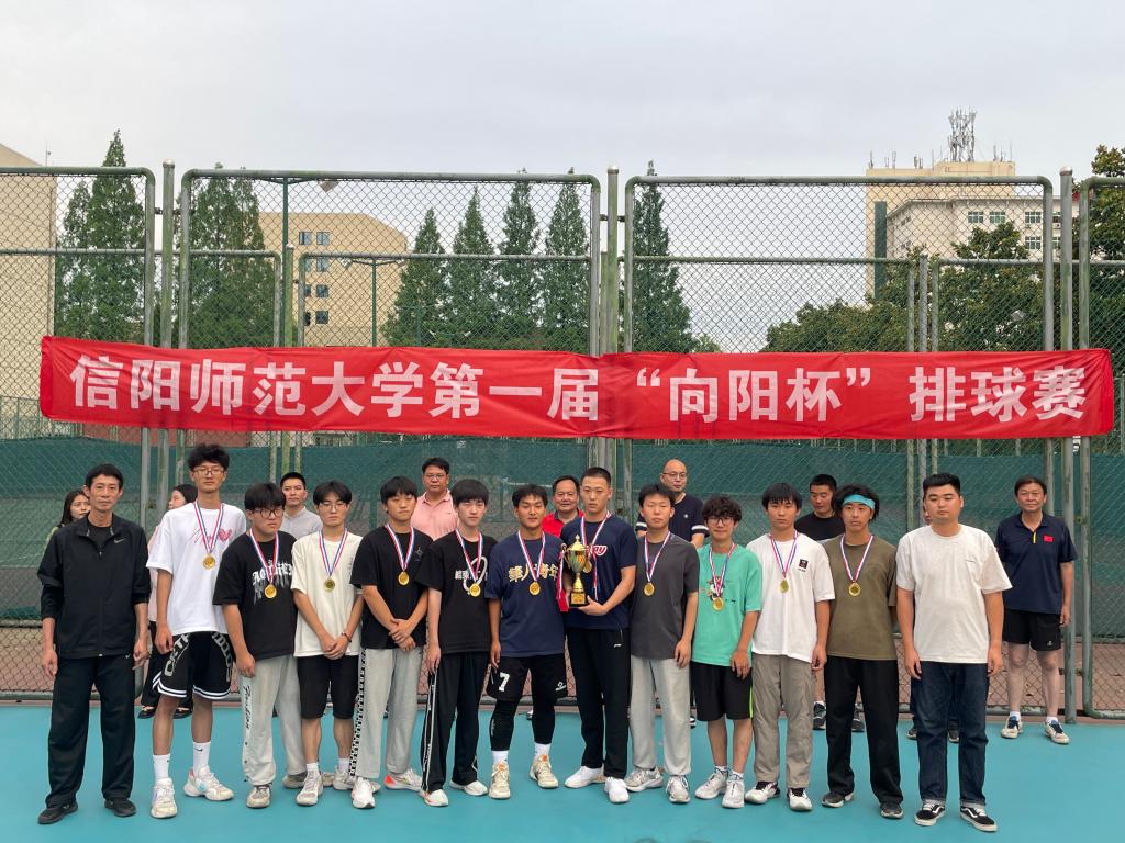 6月3日,suncitygroup太阳成集团第一届“向阳杯”排球赛师生友谊赛暨颁奖典礼在排球场举行。太阳成集团tyc151cc获得男子组第一名的好成绩,并作为学生代表队与教职工代表队开展友谊赛,体育学院院长余道明和该院团委书记冯舒心为队员颁发奖杯。