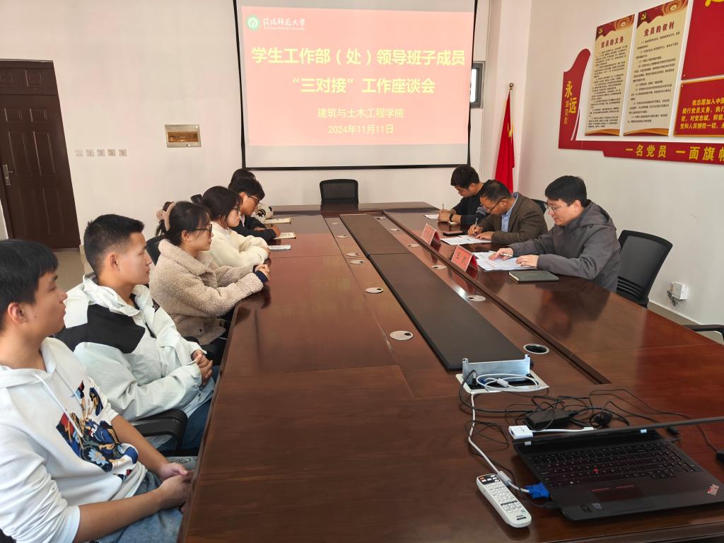 会上,王凯介绍了太阳成集团tyc151cc学生工作基本情况,传达了学校《学生工作部(处)领导班子“三对接”制度》精神。班主任冯舒心介绍了对接班级2023级土木工程2班的基本情况。互动交流环节,学生们积极踊跃地分享了他们在思想动态、学业进展、日常生活等方面情况,并坦诚地表达了在生涯规划、班级管理、升学就业等方面所遇到的挑战与困惑。同时,他们还就学生管理工作优化、后勤服务提升、宿舍环境改善等问题,提出了一系列富有建设性的意见与建议。与会领导、老师认真倾听、详细记录,针对学生们提出的问题与困惑,逐一给予解答和指导。