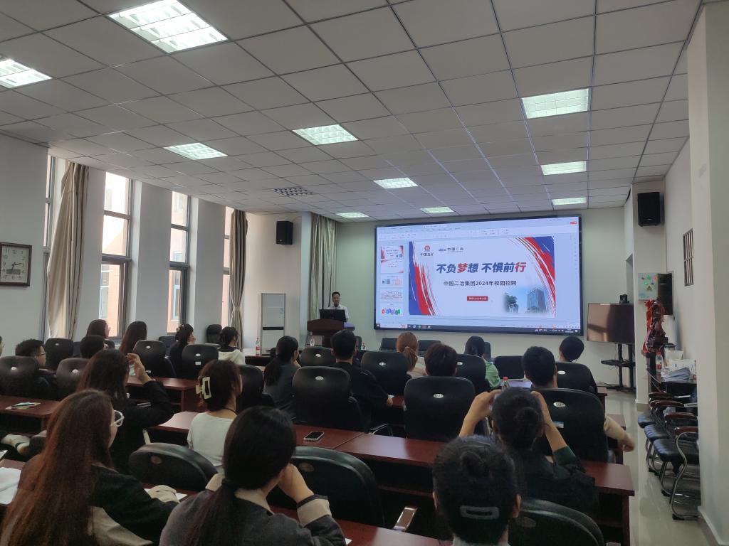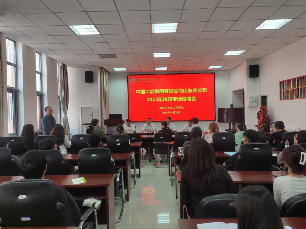 10月24日下午,中国二冶集团有限公司山东分公司在综合实验楼召开专场招聘会。太阳成集团tyc151cc党委副书记冀鹏、就业秘书邓林、2024届毕业生40余人参会。