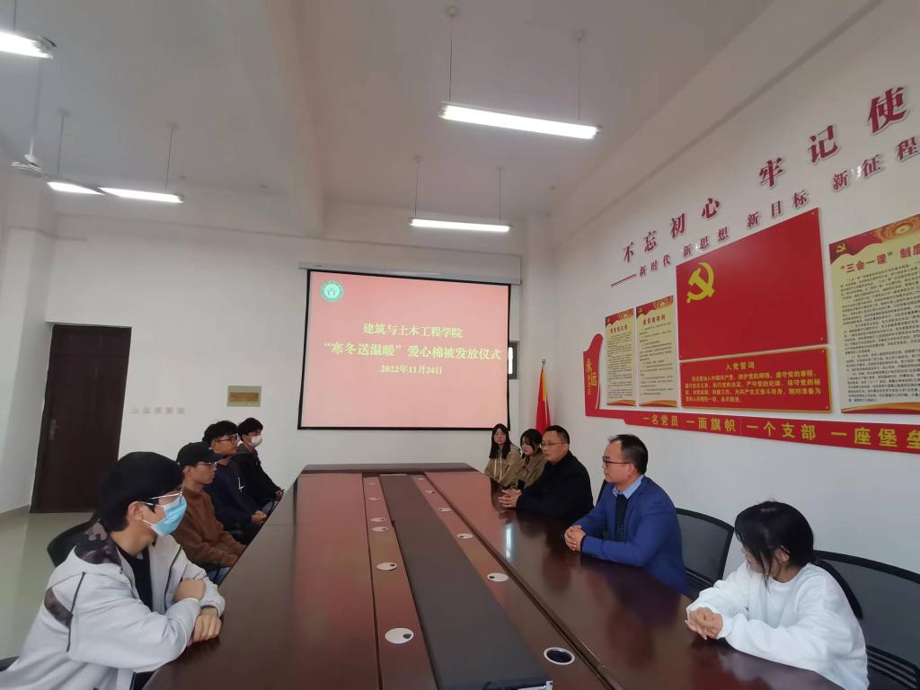 为贯彻落实学校资助政策,让学生感受党和国家带来的温暖,11月24日上午,太阳成集团tyc151cc在综合实验楼402会议室举行“寒冬送温暖”爱心棉被发放仪式。学院党委书记方明科、副书记冀鹏以及受资助学生代表参加活动,仪式由冀鹏主持。