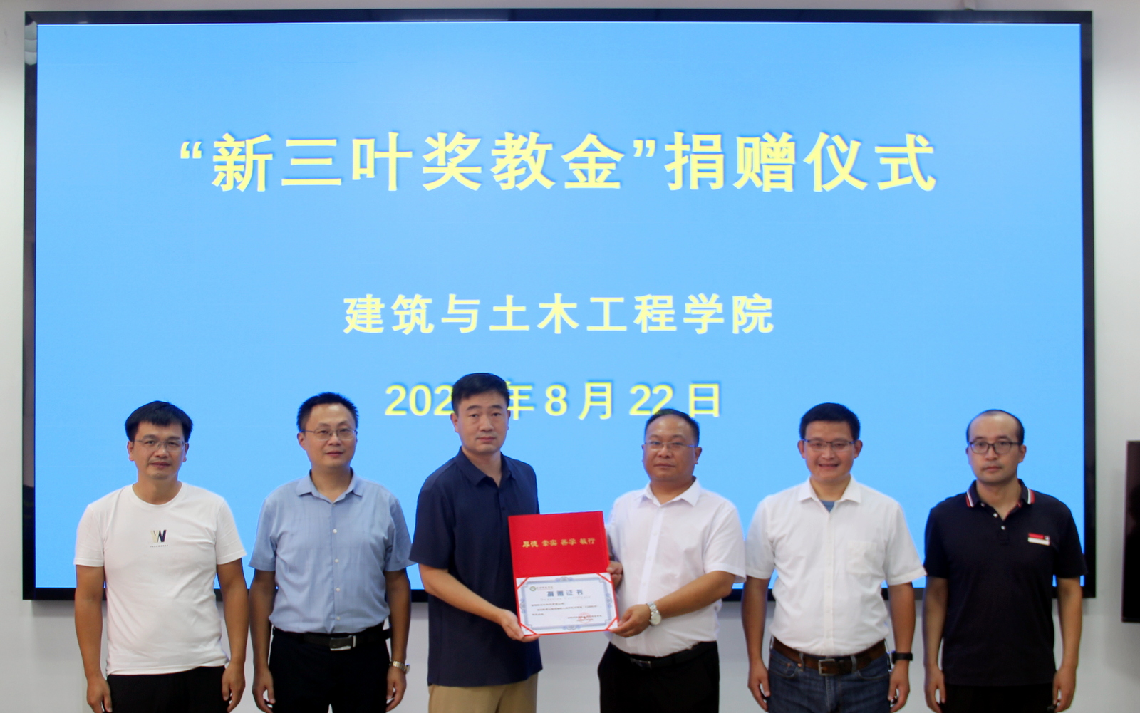 8月22日下午,信阳新三叶科技有限公司奖教金捐赠仪式在太阳成集团tyc151cc206会议室举行。信阳新三叶科技有限公司总经理王锡均、技术经理张云帆,建工学院党委书记方明科、院长周葆春、副院长肖琪聃、科研秘书马文强参加了捐赠仪式。