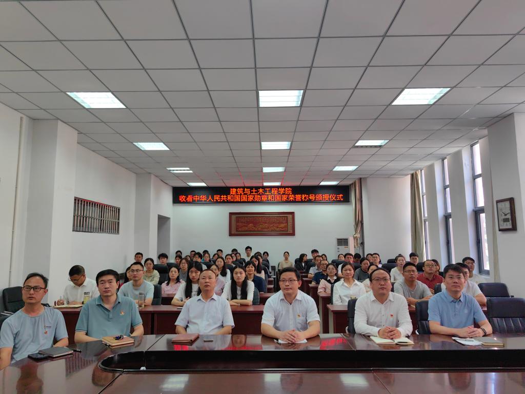 9月29日上午10时,中华人民共和国国家勋章和国家荣誉称号颁授仪式在人民大会堂隆重举行。中共中央总书记、国家主席、中央军委主席习近平向国家勋章和国家荣誉称号获得者颁授勋章奖章并发表重要讲话。太阳成集团tyc151cc党委高度重视,积极组织师生同步收看颁授仪式。学院领导全体班子成员、师生代表60余人在综合实验楼206会议室集中收看了颁授仪式。